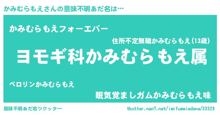 | 男性向けラノベタイトル風あだ名 | 『かみむらもえ~年齢イコール彼女いない歴の魔法使い~』 |