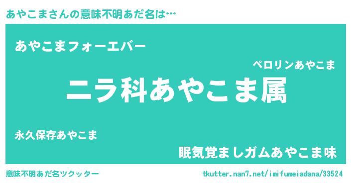 | 男性向けラノベタイトル風あだ名 | 『あやこま~年齢イコール彼女いない歴の魔法使い~』 |
