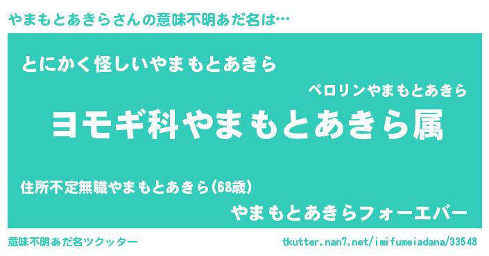 | 男性向けラノベタイトル風あだ名 | 『やまもとあきら~年齢イコール彼女いない歴の魔法使い~』 |