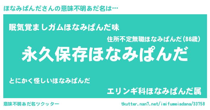 | 女子向けラノベタイトル風あだ名 | 『異世界で失敗しない100のほなみぱんだ』 |