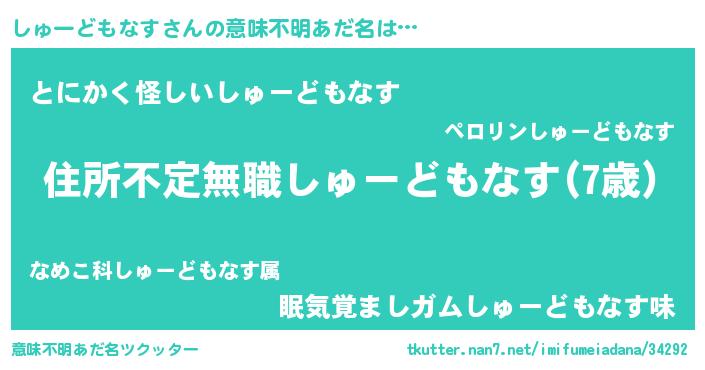 | 男性向けラノベタイトル風あだ名 | 『しゅーどもなすに滅ぼされるだけの簡単なお仕事です』 |