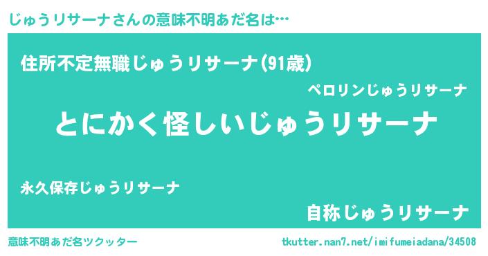 | 男性向けラノベタイトル風あだ名 | 『じゅうリサーナの嫁は女の子じゃないと思った?』 |