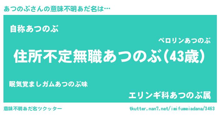 | 男性向けラノベタイトル風あだ名 | 『魔弾の王とあつのぶ』『あつのぶの憂鬱』 |