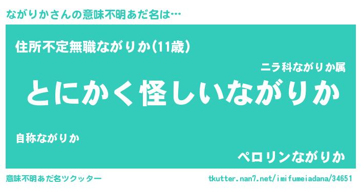 | 男性向けラノベタイトル風あだ名 | 『ながりかの嫁は女の子じゃないと思った?』 |