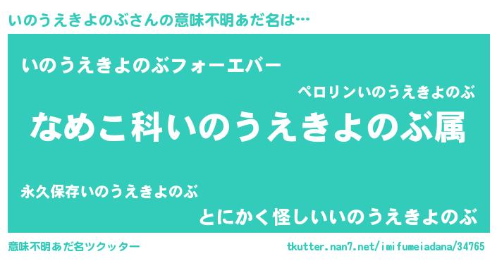 | 女子向けラノベタイトル風あだ名 | 『いのうえきよのぶの玉の輿計画!』 |