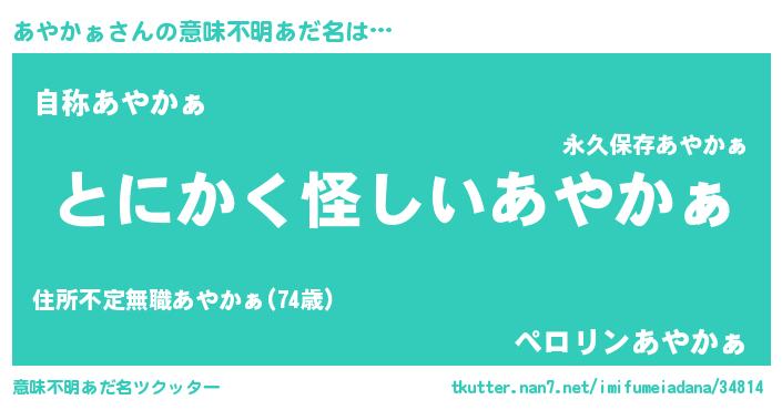| 男性向けラノベタイトル風あだ名 | 『あやかぁの嫁は女の子じゃないと思った?』 |