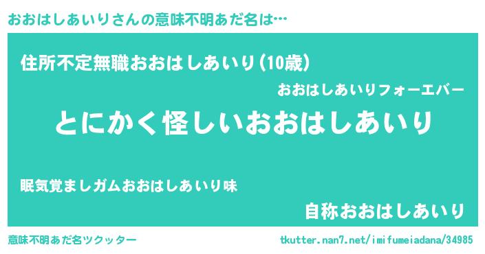 | 男性向けラノベタイトル風あだ名 | 『おおはしあいりの嫁は女の子じゃないと思った?』 |
