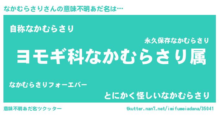 | 男性向けラノベタイトル風あだ名 | 『なかむらさり~年齢イコール彼女いない歴の魔法使い~』 |