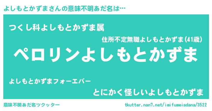 | 胡散臭い通販商品みたいなあだ名 | 『億万長者になれるブレスレット…その名も「よしもとかずま」』 |