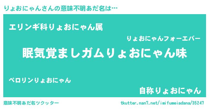 | 男性向けラノベタイトル風あだ名 | 『りょおにゃんに滅ぼされるだけの簡単なお仕事です』 |