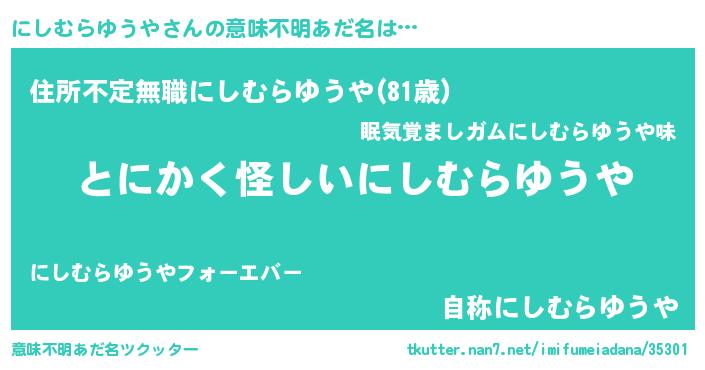 | 男性向けラノベタイトル風あだ名 | 『にしむらゆうやの嫁は女の子じゃないと思った?』 |