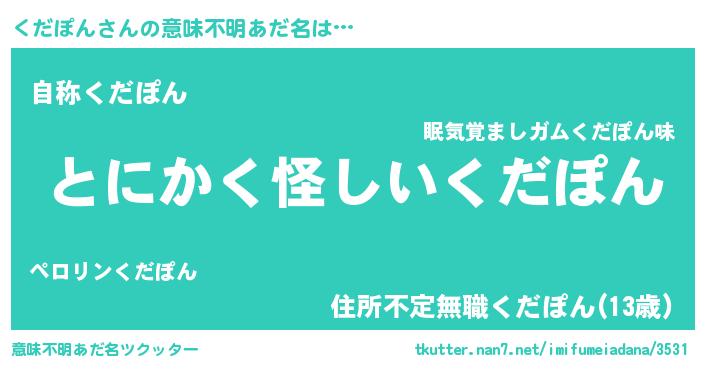 | 男性向けラノベタイトル風あだ名 | 『ダンジョンにくだぽんを求めるのは間違っているだろうか』 |