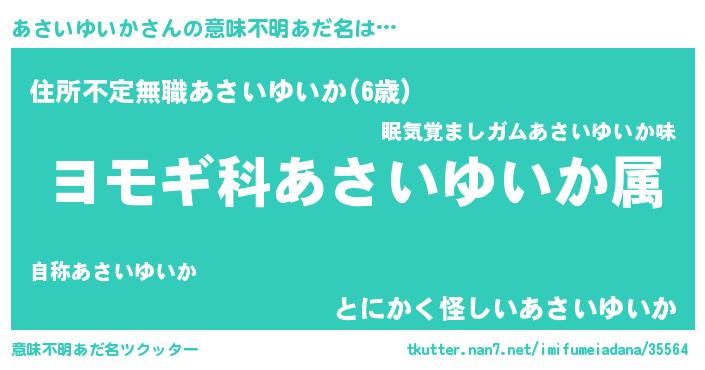 | 男性向けラノベタイトル風あだ名 | 『あさいゆいか~年齢イコール彼女いない歴の魔法使い~』 |