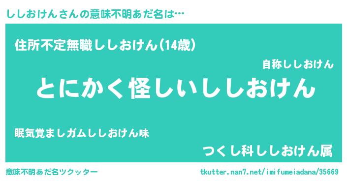 | 男性向けラノベタイトル風あだ名 | 『ししおけんの嫁は女の子じゃないと思った?』 |