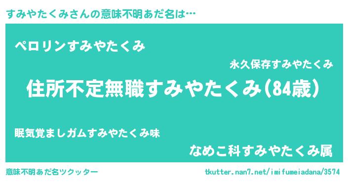 | 男性向けラノベタイトル風あだ名 | 『魔弾の王とすみやたくみ』 |