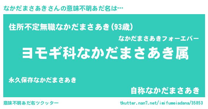 | 男性向けラノベタイトル風あだ名 | 『なかだまさあき~年齢イコール彼女いない歴の魔法使い~』 |