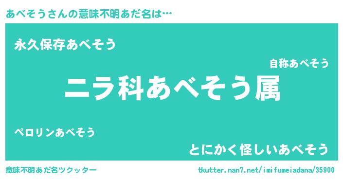 | 男性向けラノベタイトル風あだ名 | 『あべそう~年齢イコール彼女いない歴の魔法使い~』 |