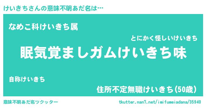 | 男性向けラノベタイトル風あだ名 | 『おまえをオタクにしてやるから、俺をけいきちにしてくれ! 』 |