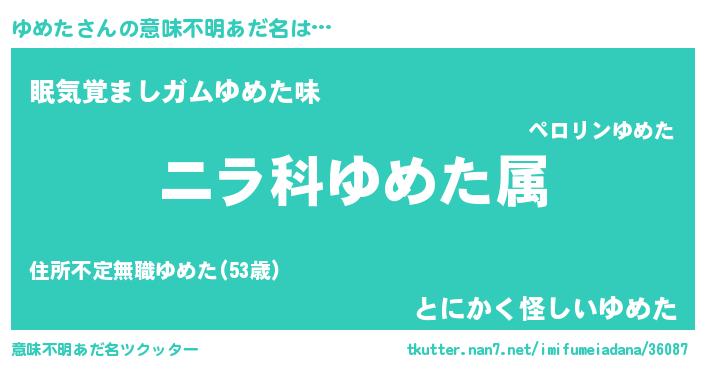 | 男性向けラノベタイトル風あだ名 | 『ゆめた~年齢イコール彼女いない歴の魔法使い~』 |