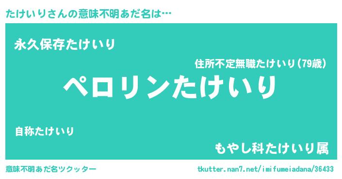 | 男性向けラノベタイトル風あだ名 | 『たけいりの憂鬱』『タケイリスレイヤー』 |