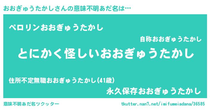 | 男性向けラノベタイトル風あだ名 | 『おおぎゅうたかしの嫁は女の子じゃないと思った?』 |