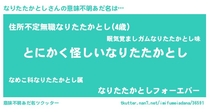 | 男性向けラノベタイトル風あだ名 | 『なりたたかとしの嫁は女の子じゃないと思った?』 |