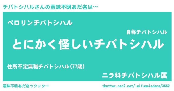 | 女子向けラノベタイトル風あだ名 | 『チバトシハルの卵を拾いまして』 |