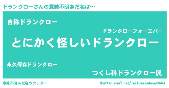 | 男性向けラノベタイトル風あだ名 | 『ダンジョンにドランクローを求めるのは間違っているだろうか』 |