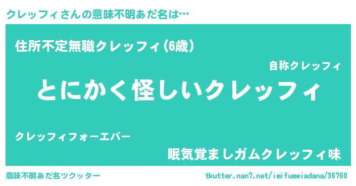 | 男性向けラノベタイトル風あだ名 | 『ダンジョンにクレッフィを求めるのは間違っているだろうか』 |