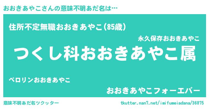| 男性向けラノベタイトル風あだ名 | 『おおきあやこ~年齢イコール彼女いない歴の魔法使い~』 |