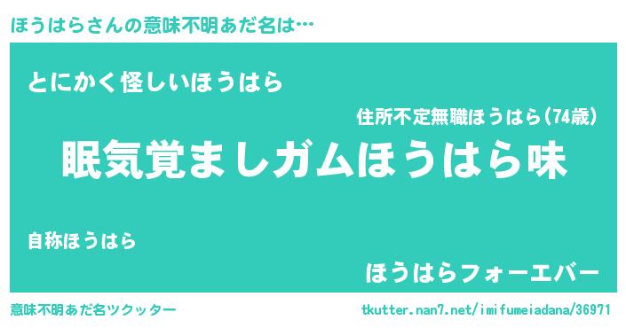 | ヒーロー風カッコイイあだ名 | 『慈愛の使者ほうはら』『暗黒騎士ホウ』 |