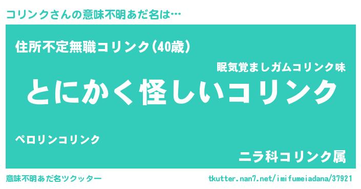 | 男性向けラノベタイトル風あだ名 | 『コリンクに滅ぼされるだけの簡単なお仕事です』 |