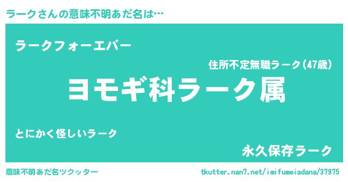 | 男性向けラノベタイトル風あだ名 | 『ラーク~年齢イコール彼女いない歴の魔法使い~』 |