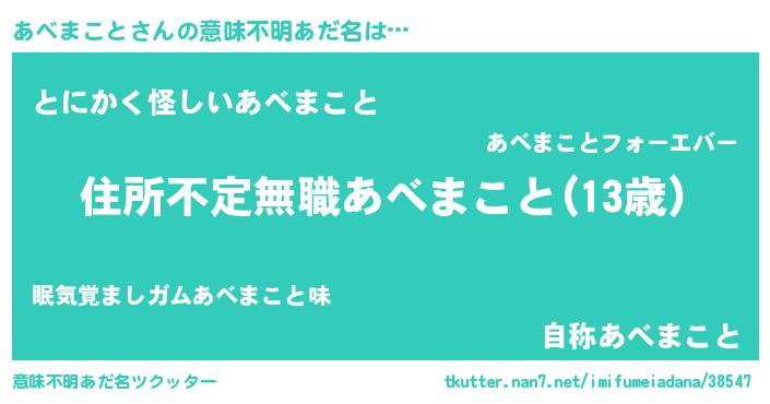 | 男性向けラノベタイトル風あだ名 | 『うちのあべまことが世界を掌握している!』 |