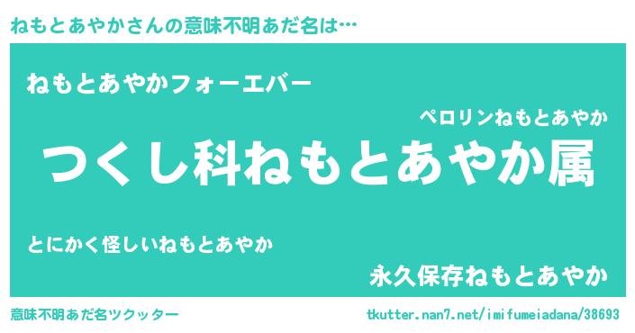 | 男性向けラノベタイトル風あだ名 | 『ねもとあやか~年齢イコール彼女いない歴の魔法使い~』 |