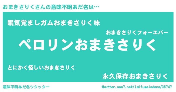 | 男性向けラノベタイトル風あだ名 | 『オマキサリクアートオンライン』 |
