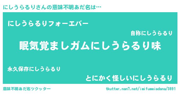 | 男性向けラノベタイトル風あだ名 | 『うちのにしうらるりが世界を掌握している!』 |