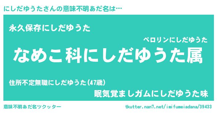 | 胡散臭い通販商品みたいなあだ名 | 『来世でも幸せになれる水素水…その名も「にしだゆうた」』 |