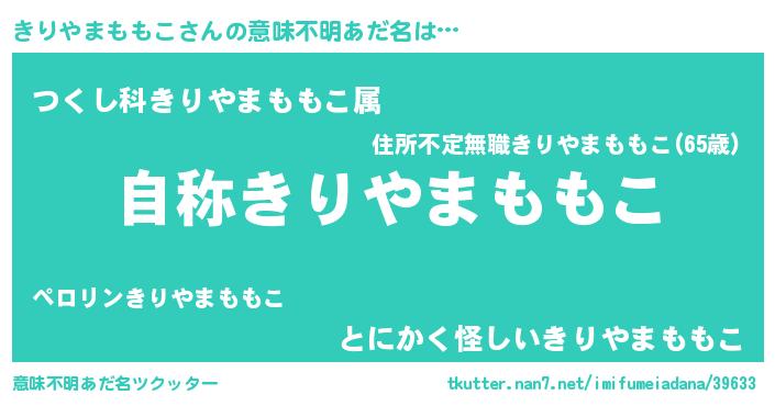 | 男性向けラノベタイトル風あだ名 | 『Re:きりやまももこから始める異世界生活』 |