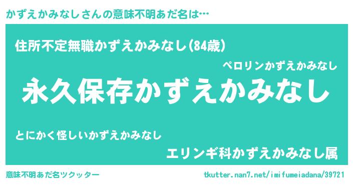| 男性向けラノベタイトル風あだ名 | 『かずえかみなしという概念が存在しない退屈な世界 』 |