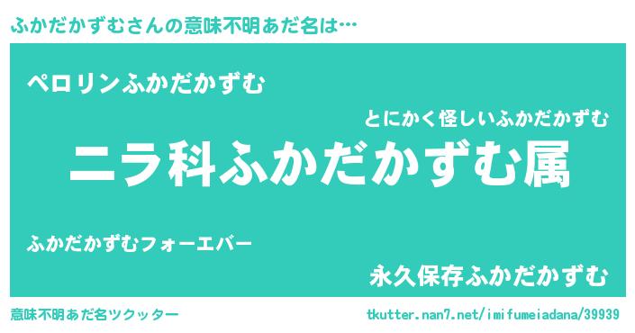 | 男性向けラノベタイトル風あだ名 | 『ふかだかずむ~年齢イコール彼女いない歴の魔法使い~』 |
