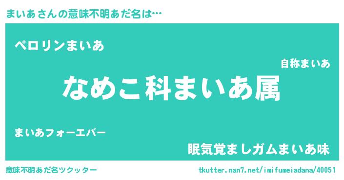 | 料理風あだ名 | 『まいあごはん』『まいあのトマト煮』 |