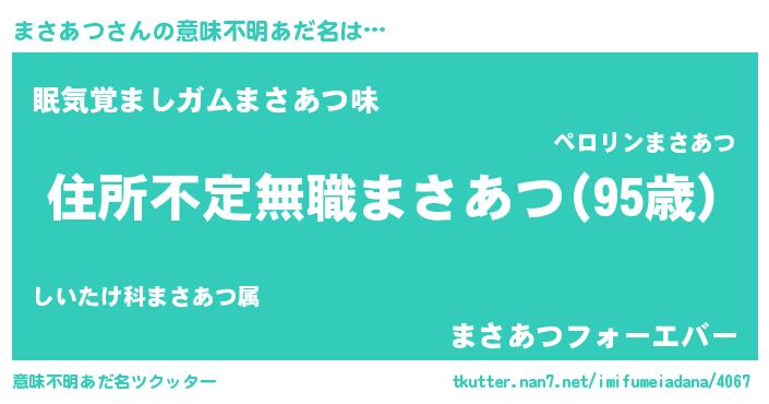 | 男性向けラノベタイトル風あだ名 | 『魔弾の王とまさあつ』『緋弾のマサアツ』 |