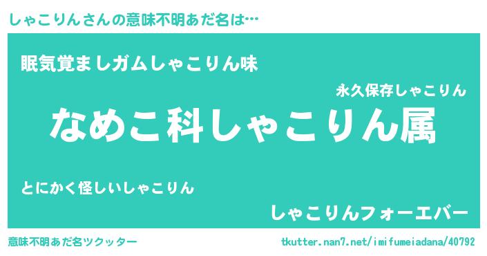 | 男性向けラノベタイトル風あだ名 | 『転生したらしゃこりんだった件』 |