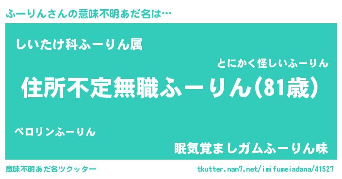 | 男性向けラノベタイトル風あだ名 | 『魔弾の王とふーりん』 |