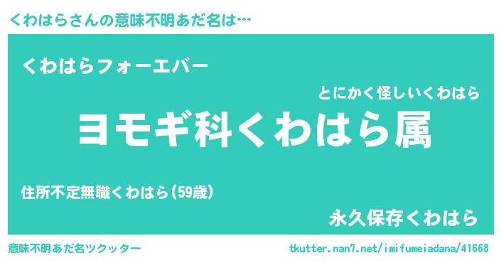 | 男性向けラノベタイトル風あだ名 | 『くわはら~年齢イコール彼女いない歴の魔法使い~』 |