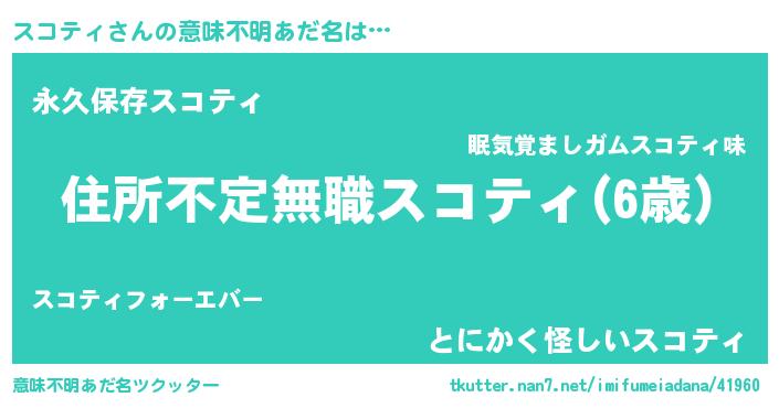 | 男性向けラノベタイトル風あだ名 | 『この素晴らしい世界にスコティを!』 |