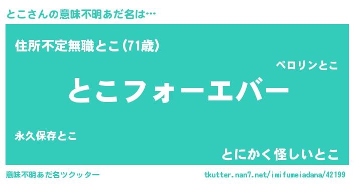 | 男性向けラノベタイトル風あだ名 | 『とこに滅ぼされるだけの簡単なお仕事です』 |