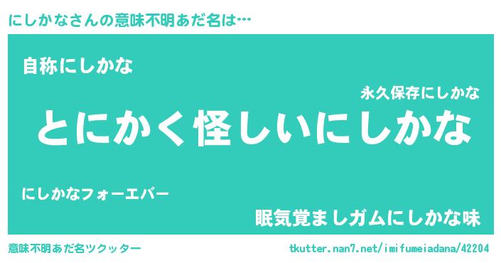 | 女子向けラノベタイトル風あだ名 | 『にしかなの卵を拾いまして』 |
