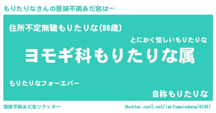 | 男性向けラノベタイトル風あだ名 | 『もりたりな~年齢イコール彼女いない歴の魔法使い~』 |